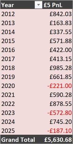 Lifetime PnL Update: +£5,630.68 to £5 bets