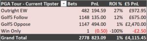 Our current Golf tipster joined us in 2014 the record of his main selections on the PGA Tour stands at +27% ROI after 482 tips. (£972.95 profit to £5 bets)